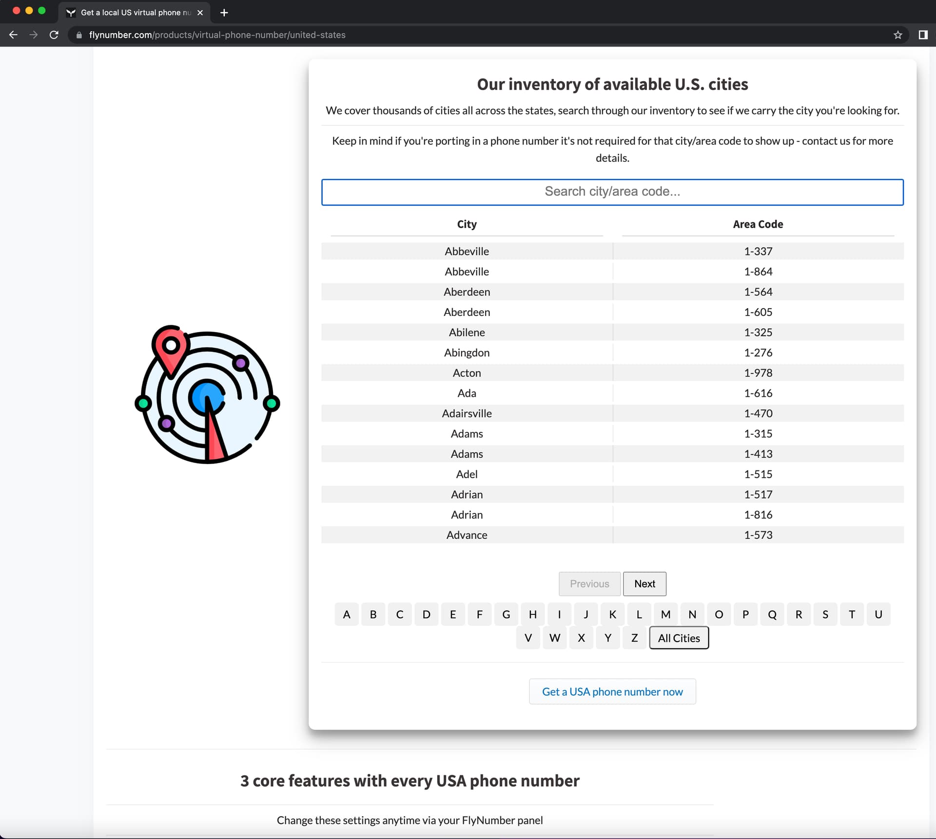 You can search by city, area code or sort by the first letter in the city. (screenshot below)